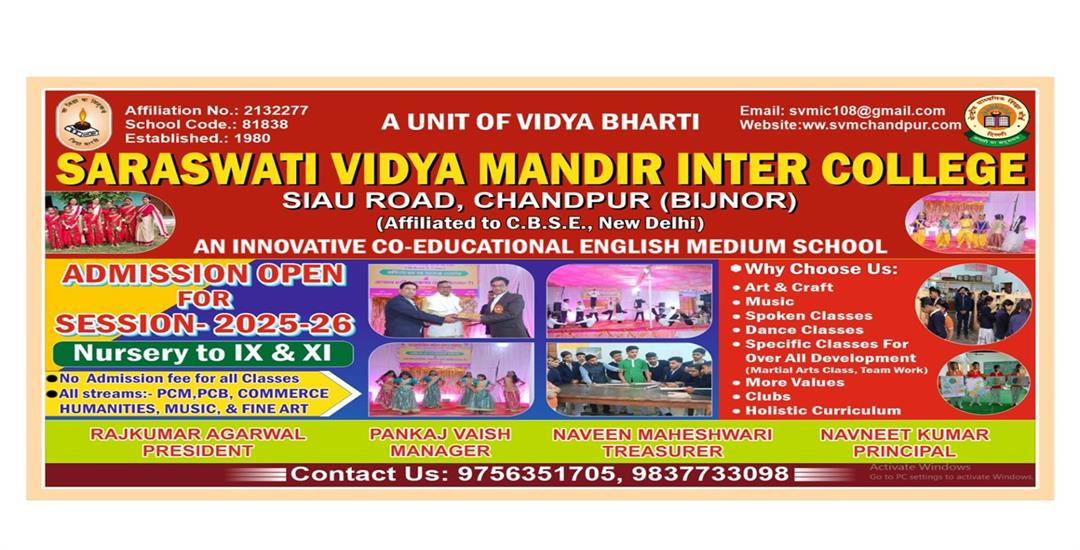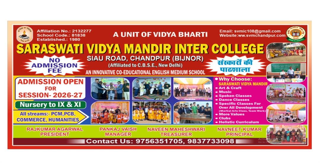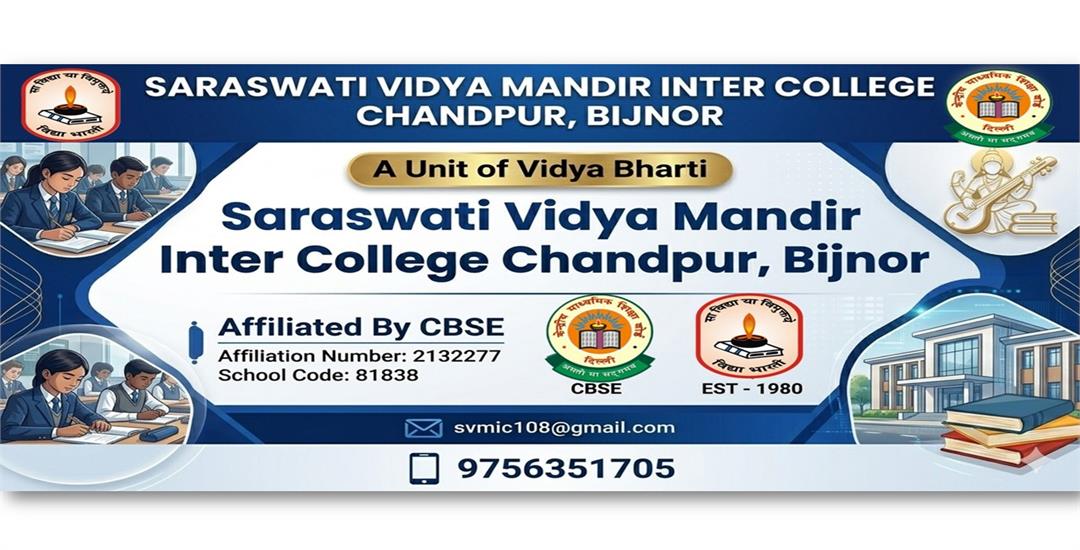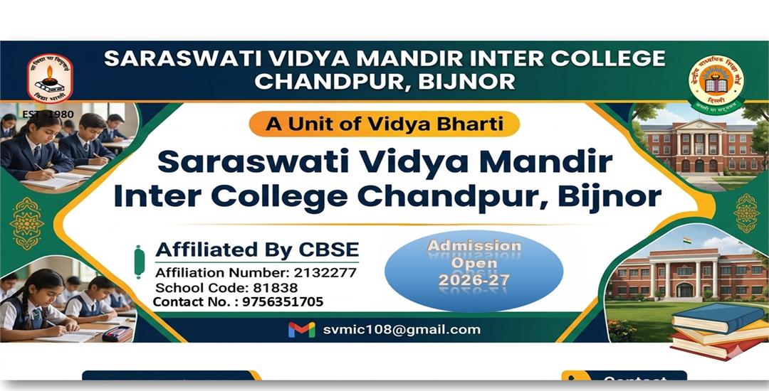 A hearty welcome to the website of Saraswati Vidya Mandir Inter College, Chandpur, dedicated to the integration of Indian culture, values, and modern education since 1980. In this journey of more than four decades, we have updated ourselves with the times so that our students are prepared for the challenges of the 21st century.
